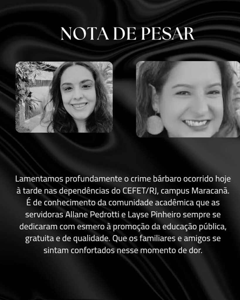 Lamentamos profundamente o crime bárbaro ocorrido hoje à tarde nas dependências do CEFET/RJ, campus Maracanã. É de conhecimento da comunidade acadêmica que as servidoras Allane Pedrotti e Layse Pinheiro sempre se dedicaram com esmero à promoção da educação pública, gratuita e de qualidade. Que os familiares e amigos se sintam confortados nesse momento de dor.